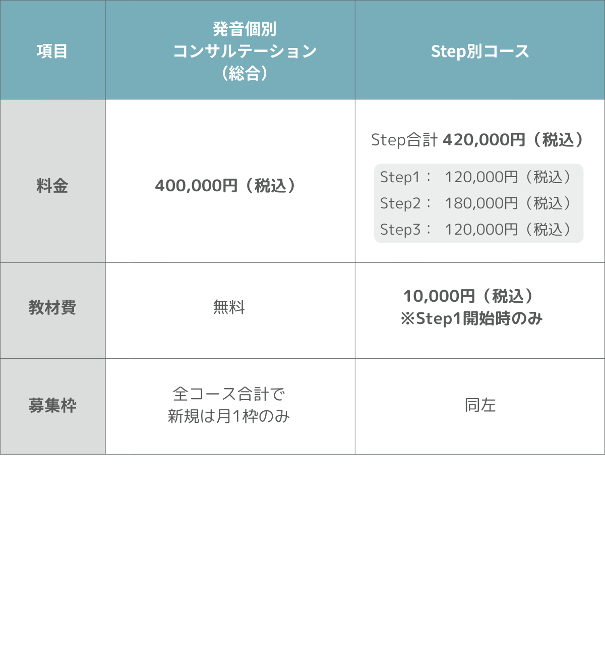 英語発音・個別コンサルティングコース(総合)の内容をStep 1〜Step 3に分け、段階に合わせて取り組めるコースです。